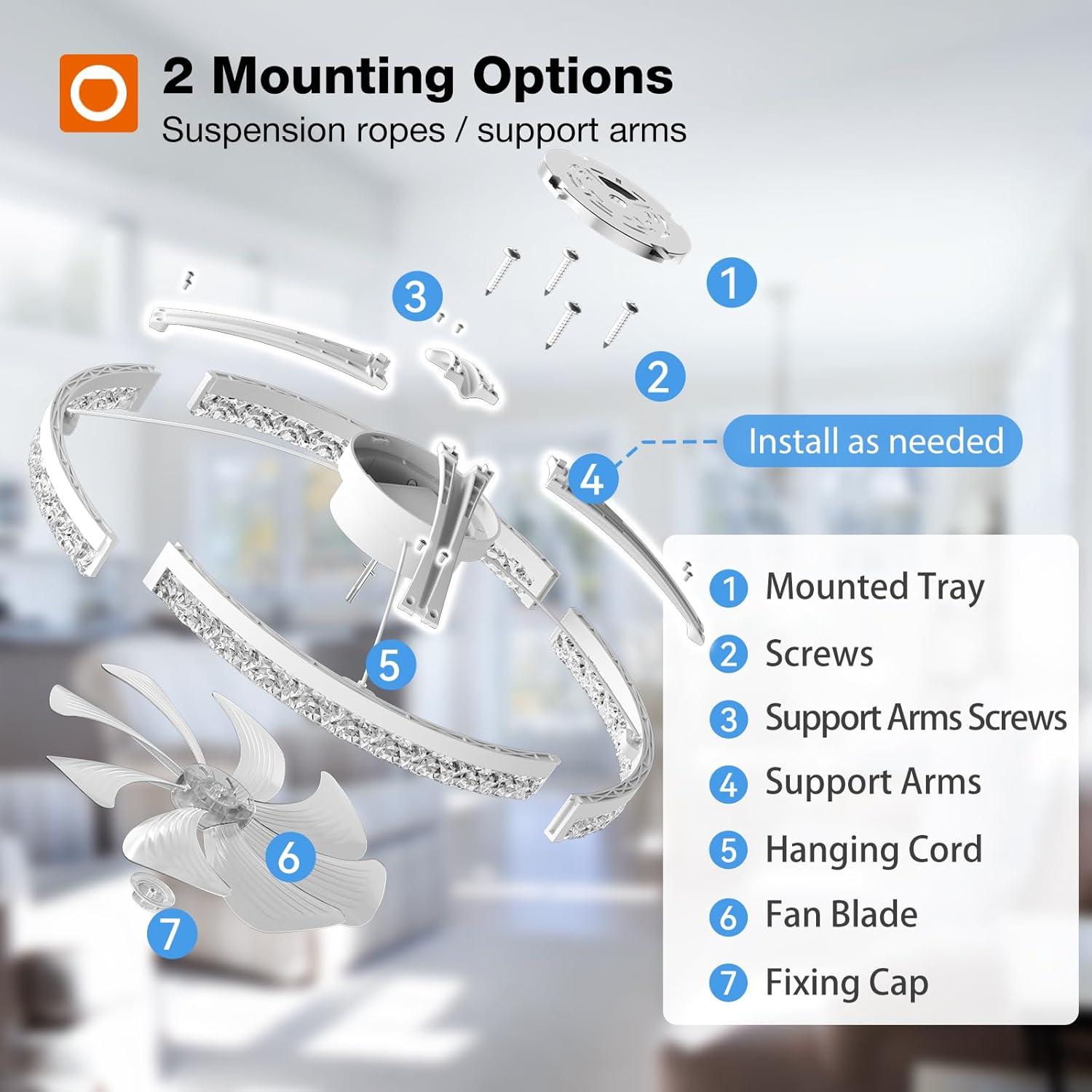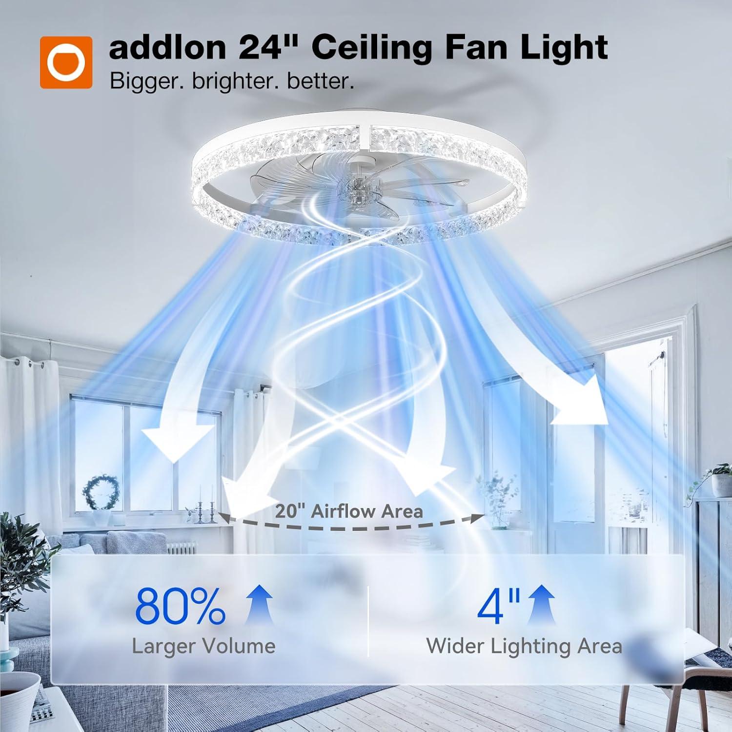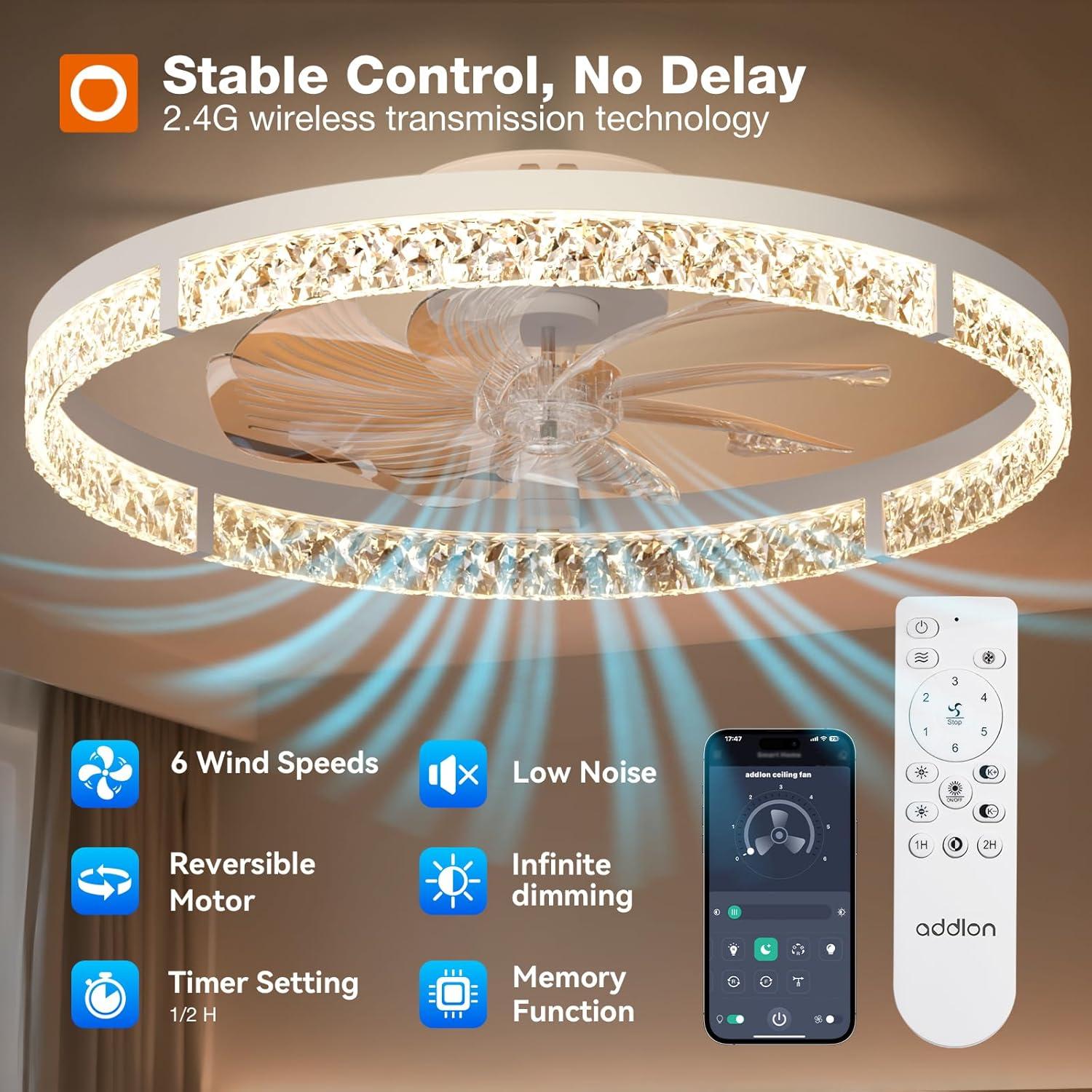 addlon Ceiling Fans with Lights and Remote, 24'' Low Profile Flush Mount Ceiling Fan, 3000–6000K Dimmable LED Fandelier, Bladeless Crystal Fan Light for Bedroom, Kitchen, Living Room, Black(White / Crystal)